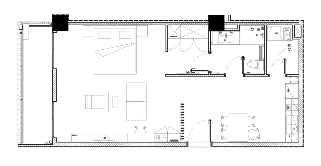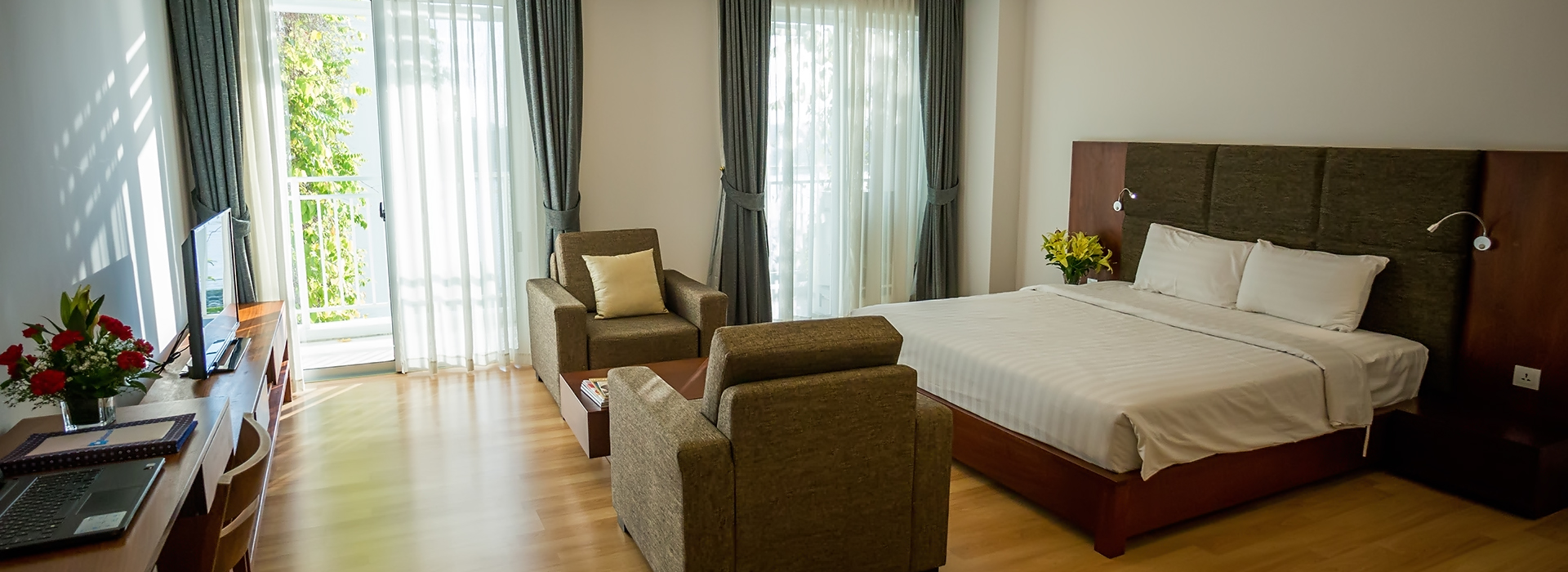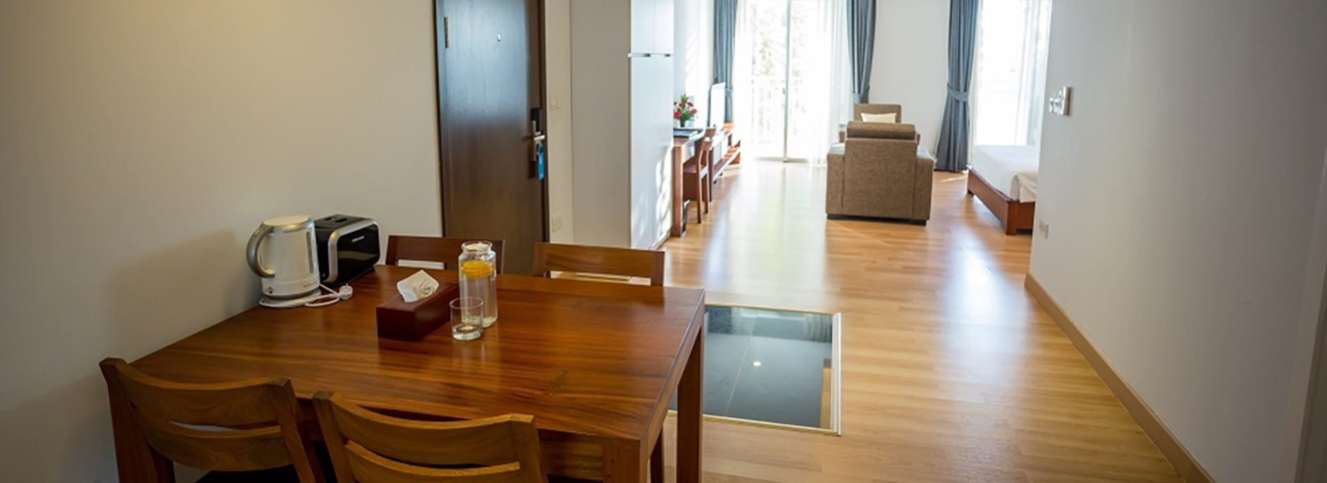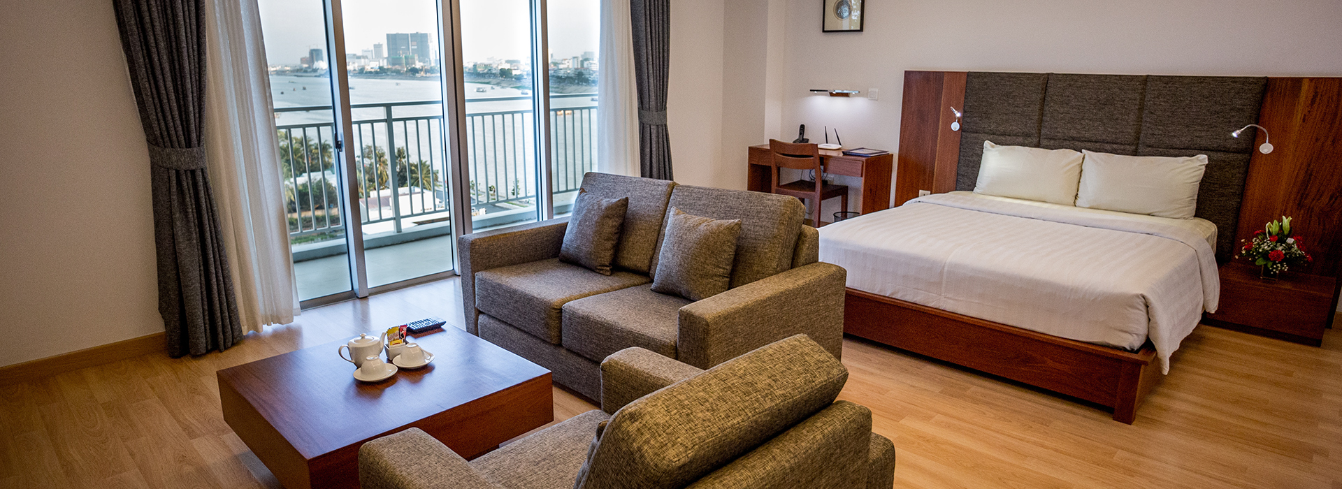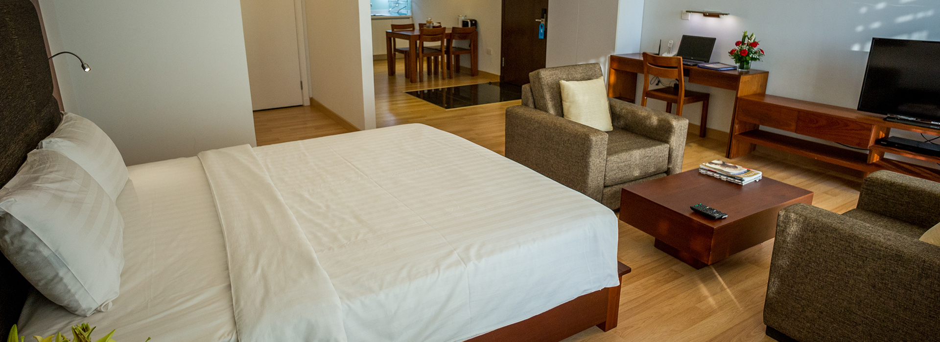 Our spacious studio apartment, ideally design for single or a couple occupants who looks for both long and short term accommodation in Phnom Penh. Measuring between 62 and 65 square meters, each apartment is fully equipped with kitchenette living area, dining area, en-suit bathroom, a high quality double bed, and laundry room with washing-drying machine, and a flat screen LCD TV.