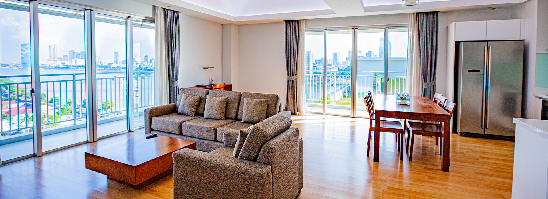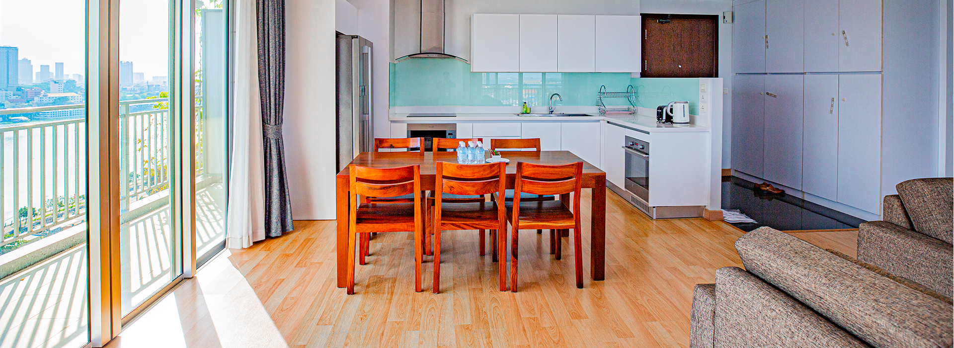 Indulge in this extraordinary spacious fully furnished living area of three-bedroom apartment with breath-taking city view and river view from your balcony. Our three-bedroom apartment ideally design for the occupants who seek for privacy and comfort while enjoy a convivial time with their love ones.